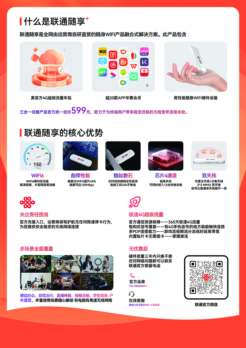 中國聯通隨享+無限流量隨身wifi送影視音樂APP年費會員|高性能隨身wifi 穩定流暢的高性能無線寬帶
